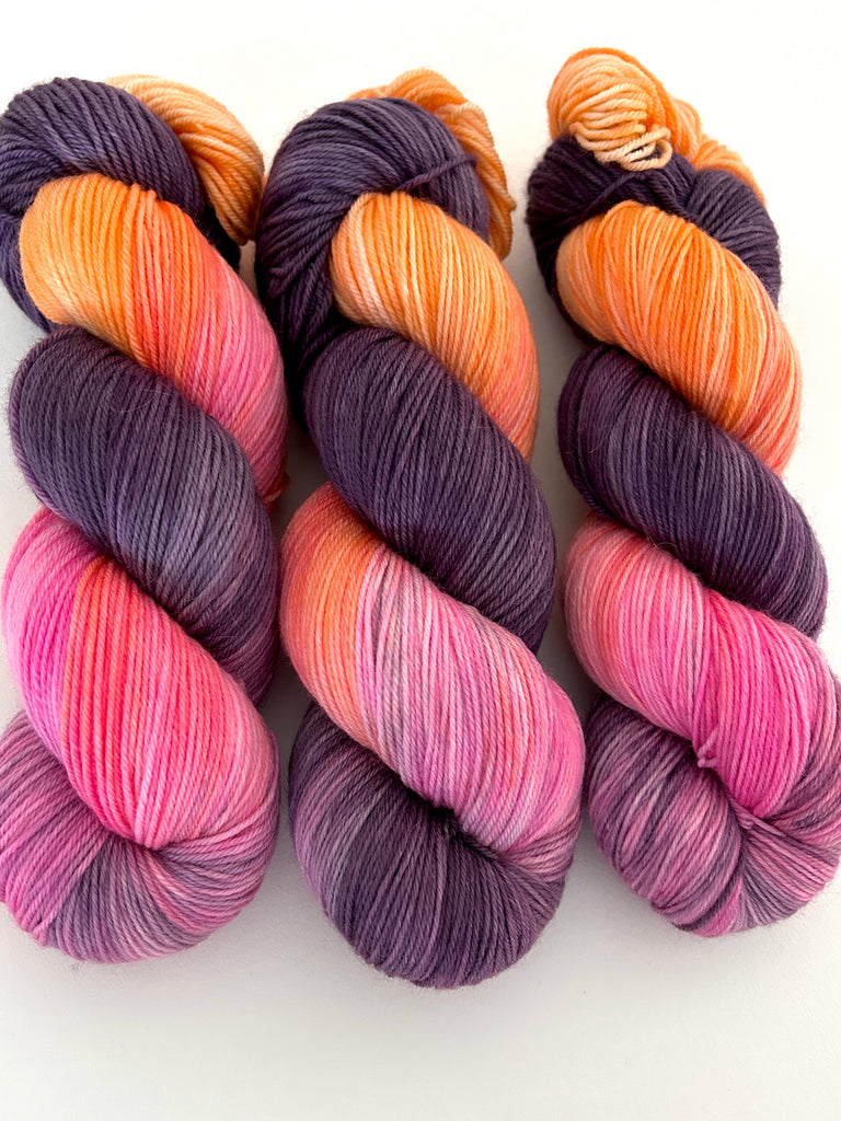 Sunset Tides is the soft warm glow of the sun departing to another place, a sky awash with purple and orange tones dyed on a yarn base of super fine merino with 15% nylon also making it suitable for socks. Looking to add some texture to your project? We also have Sunset Tides on our Alpaca lace weight fluff in our lace weight yarn section.