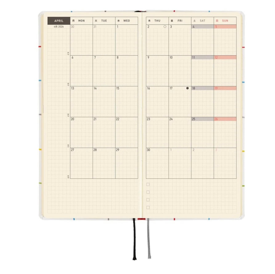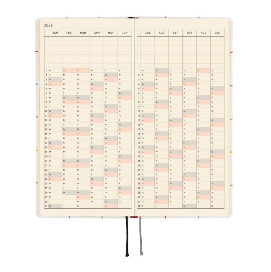 The Weeks book has space for writing in plans or journal entries, and it also has 71 pages of grid paper memo pages in the back (75 pages in the English edition). The back of the book contains bonus pages, including Memories 2026 and 12 Switches to Help You Focus.