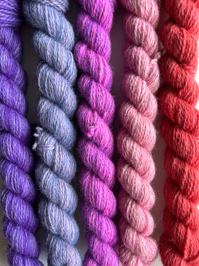 Hand dyed nsw 100% Shetland yarn now available as mini skein sets for use in your Fair Isle project! A woollen spun yarn but still a 4ply weight. At 110m per 20g skein its relatively economical too. Shetland yarn is sheared from the sheep on the islands that roam quite freely feeding on natural heathers and seaweed on the beaches. Rustic in nature both the climate and the diet of the flocks produces a wool that is warm and strong.