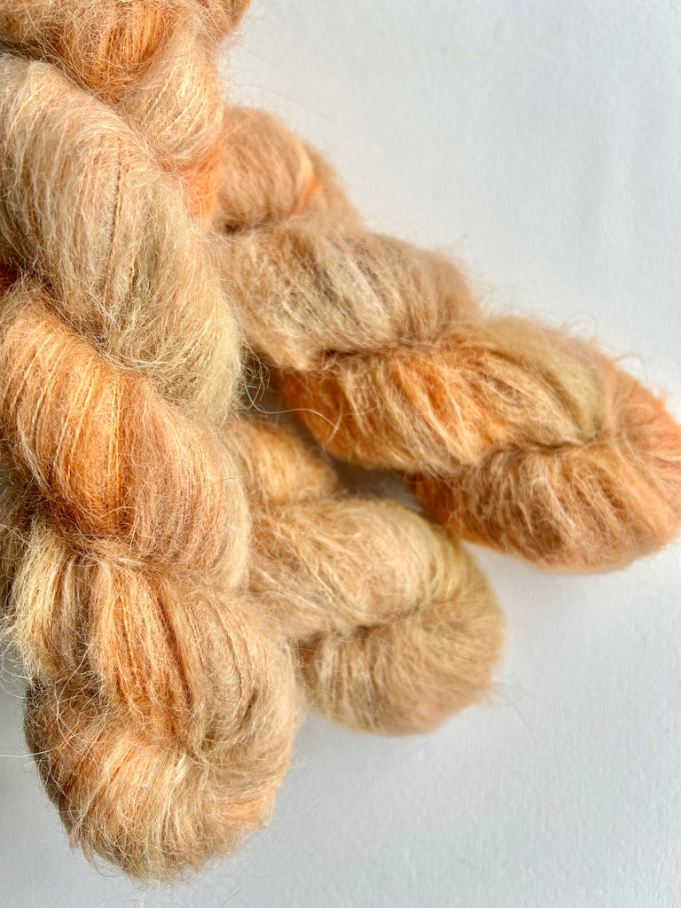Hand dyed on a super soft yarn base that contains a super soft baby alpaca fluff with silk. We also have Autumn Rays on our 4ply weight superfine merino with nylon in our 4ply weight yarn section.