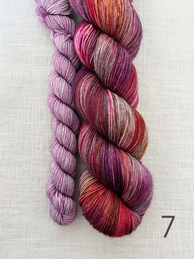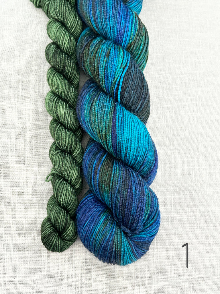 Ready to ship the yarn base for all sets are: Merino Sock: 1 x 100g fingering skein 75% SW Merino with 25% nylon 425m. With 1 x 20g/80m mini skein (also merino sock)