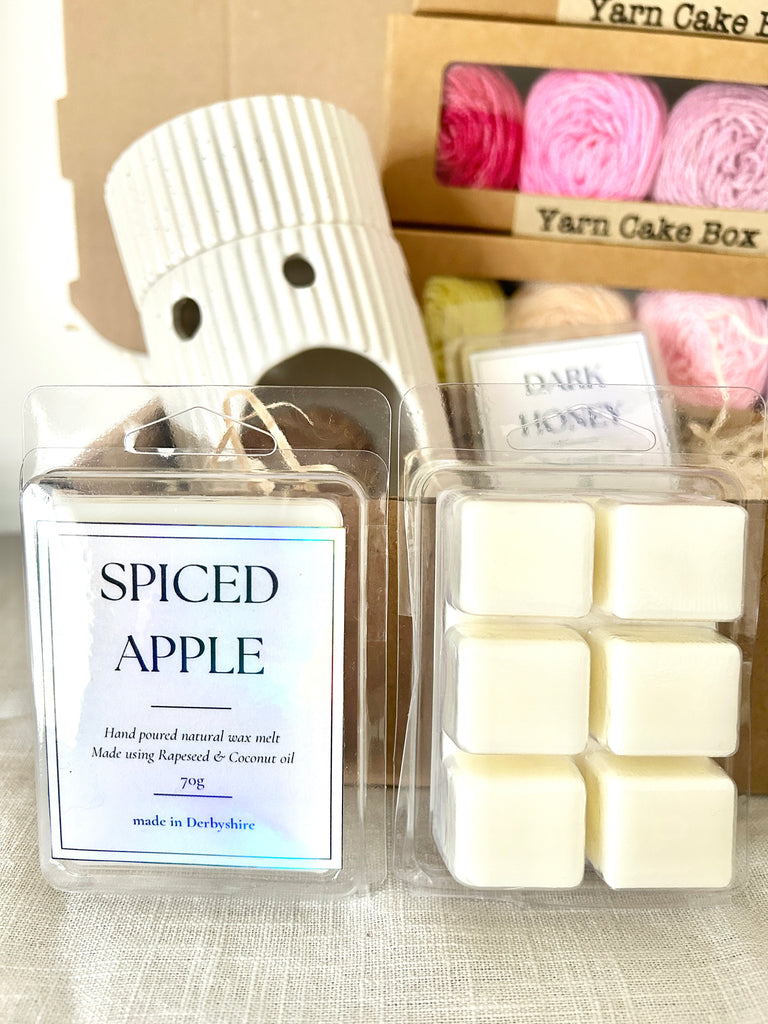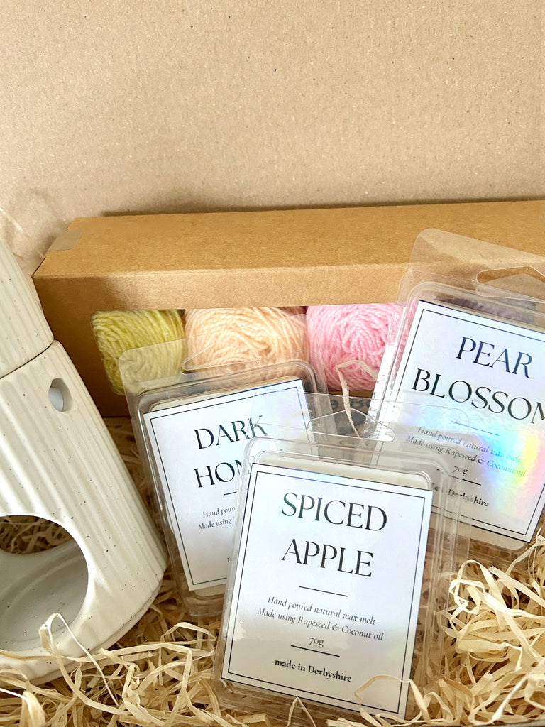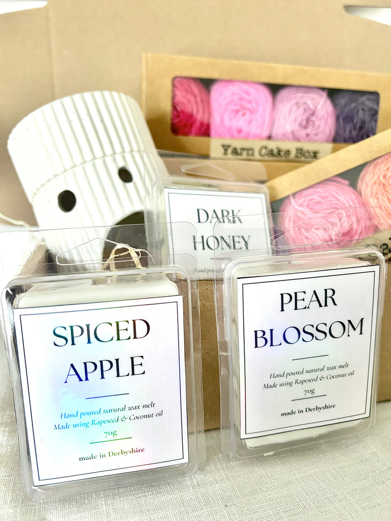 Treat yourself or a loved one to one of our new wax melt gift boxes. The box contains 3 x 70g bars of hand poured coconut & rapeseed wax melts, a beautiful tall ceramic wax melter, 1 x a mystery yarn cake box of 4 x 20g mini skeins on the base of your choosing ready to cast on. Photos are examples of our yarn cake boxes, you will receive 1 box and it might be a different colour palette to the ones in the photographs. The wax melt fragrances for this box are the same as in the photographs: